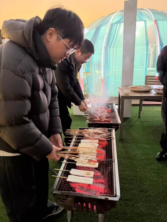 กิจกรรมสร้างทีมยังรวมถึงการทำบาร์บีคิวแบบบริการตนเองให้กับพนักงานอีกด้วย ในงานทุกคนร่วมมือกันเตรียมวัตถุดิบและทำอาหาร โดยมีโต๊ะที่เต็มไปด้วยวัตถุดิบสดใหม่และอาหารเลิศรส พนักงานนั่งอยู่ด้วยกัน เพลิดเพลินกับบาร์บีคิวในขณะที่พูดคุยเกี่ยวกับงานและชีวิต ด้วยเสียงหัวเราะและความสุขก็อบอวลไปด้วย ทุกคนยกแก้วขึ้นและพูดคุยกันอย่างมีความสุข แสดงให้เห็นถึงบรรยากาศการทำงานที่กลมกลืนและอบอุ่นของทีม Yongjun Textile อย่างเต็มที่